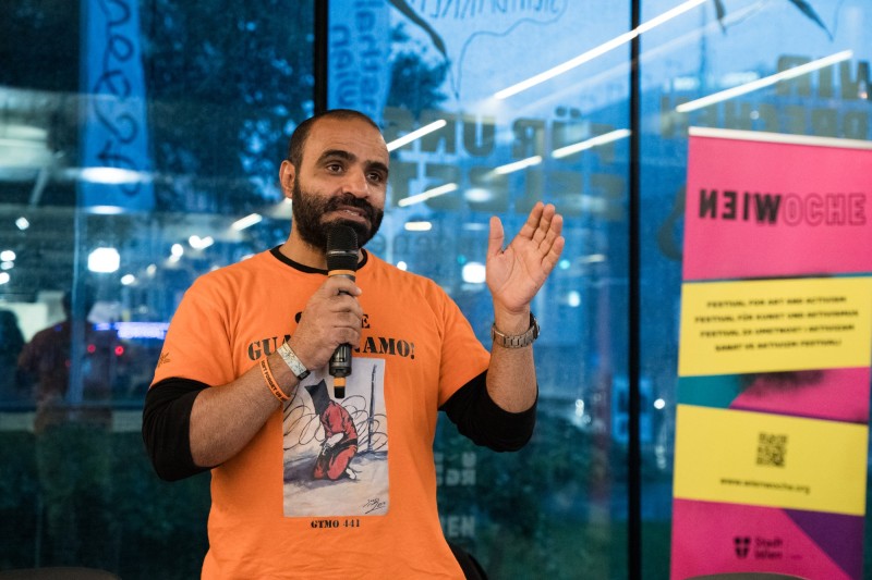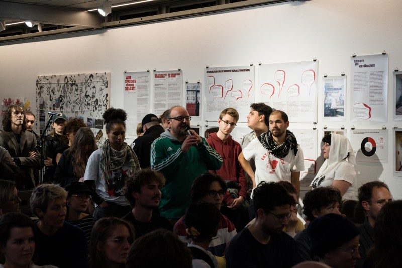 Guided tour through the exhibition: Mansoor Ahmed Saad Abdo Adayfi, Guantánamo Project, Rubia Salgado, das kollektiv, Herwig Baumgartner, Union für die Rechte von Gefangenen, Martin Steinbach, inmates-shelter